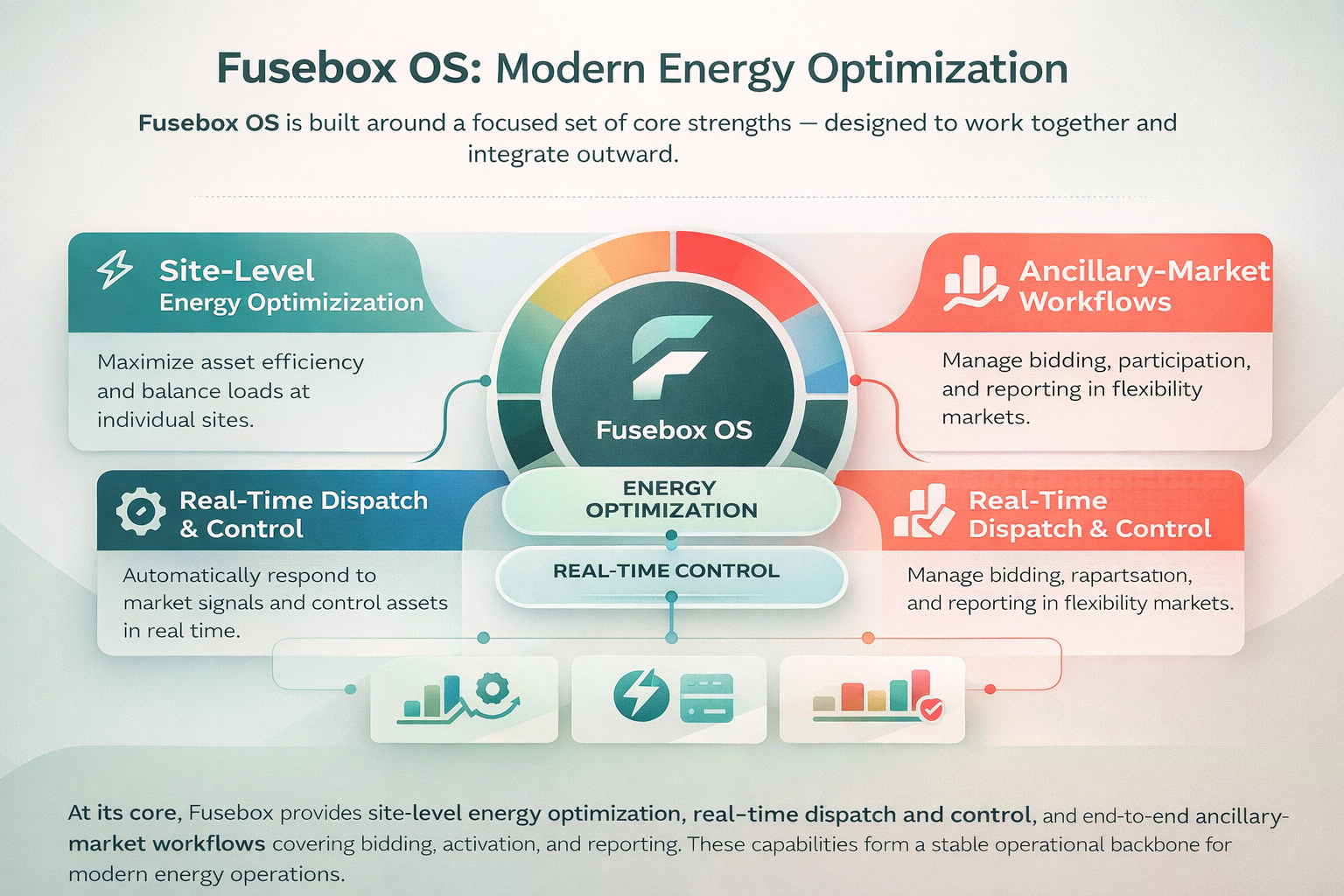 At its core, Fusebox provides site-level energy optimization, real-time dispatch and control, and end-to-end ancillary-market workflows covering bidding, activation, and reporting. These capabilities form a stable operational backbone for modern energy operations.