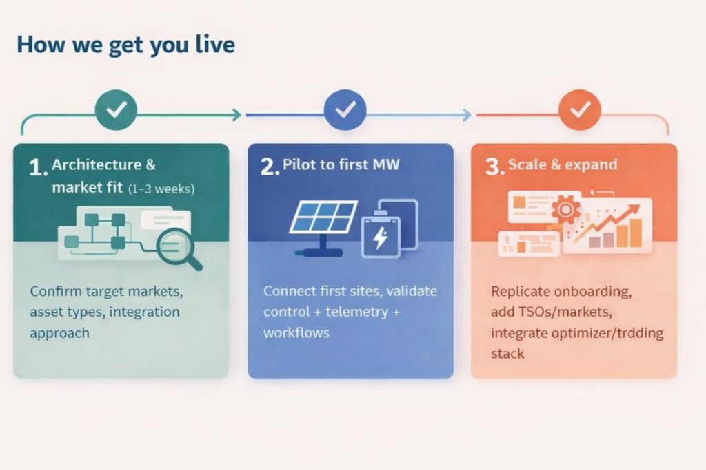 - Pilot to first MW: connect first sites, validate control + telemetry + workflows